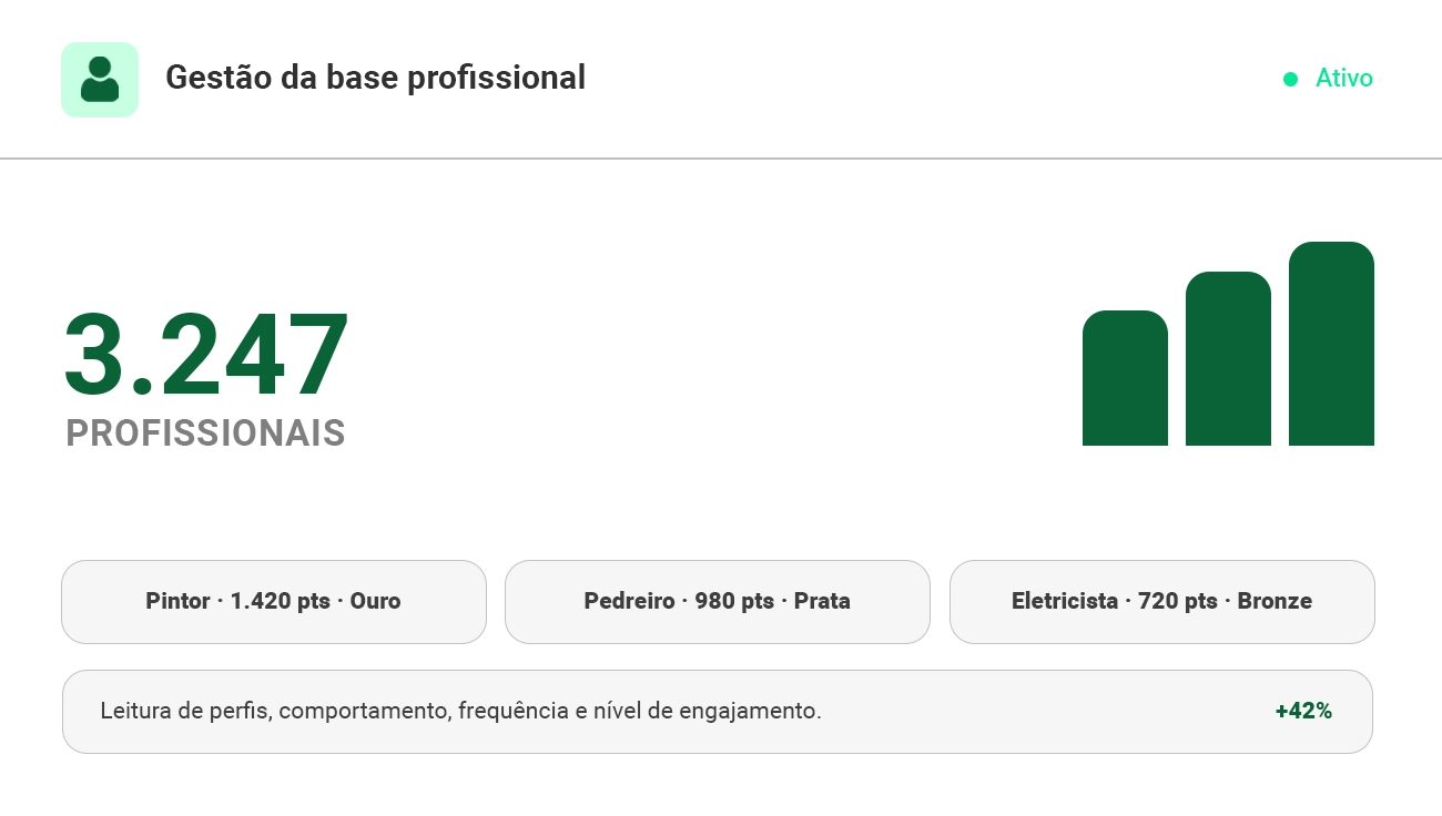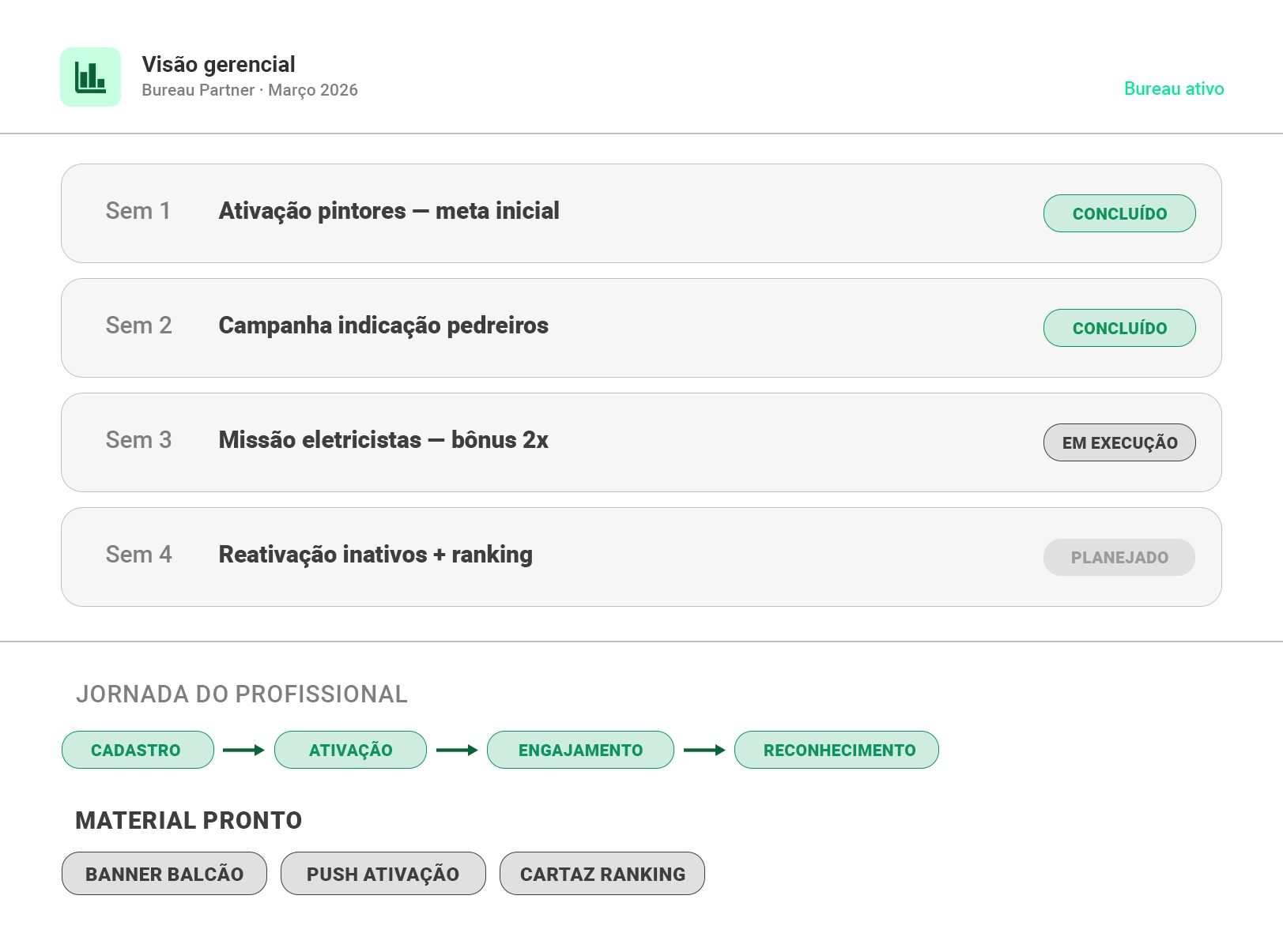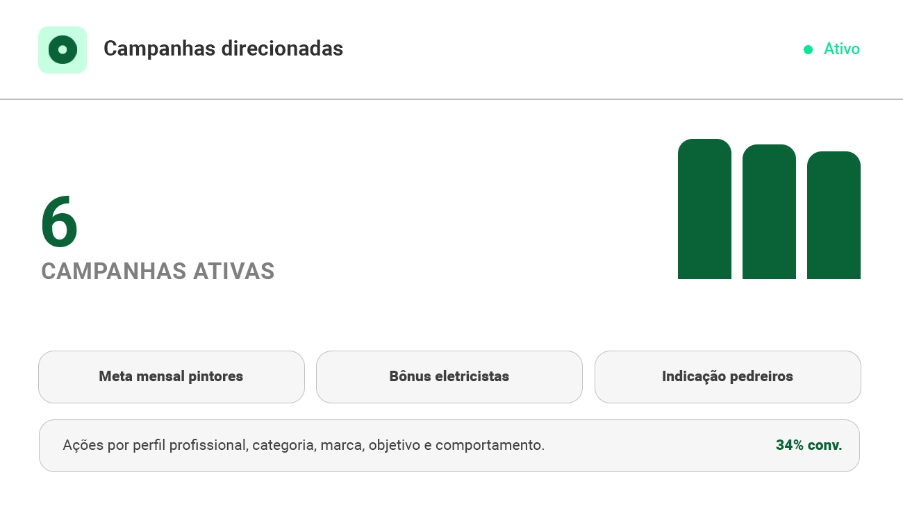 Campanhas segmentadas por tipo de profissional — pintores, pedreiros, eletricistas — com metas, missões e premiação por participação.