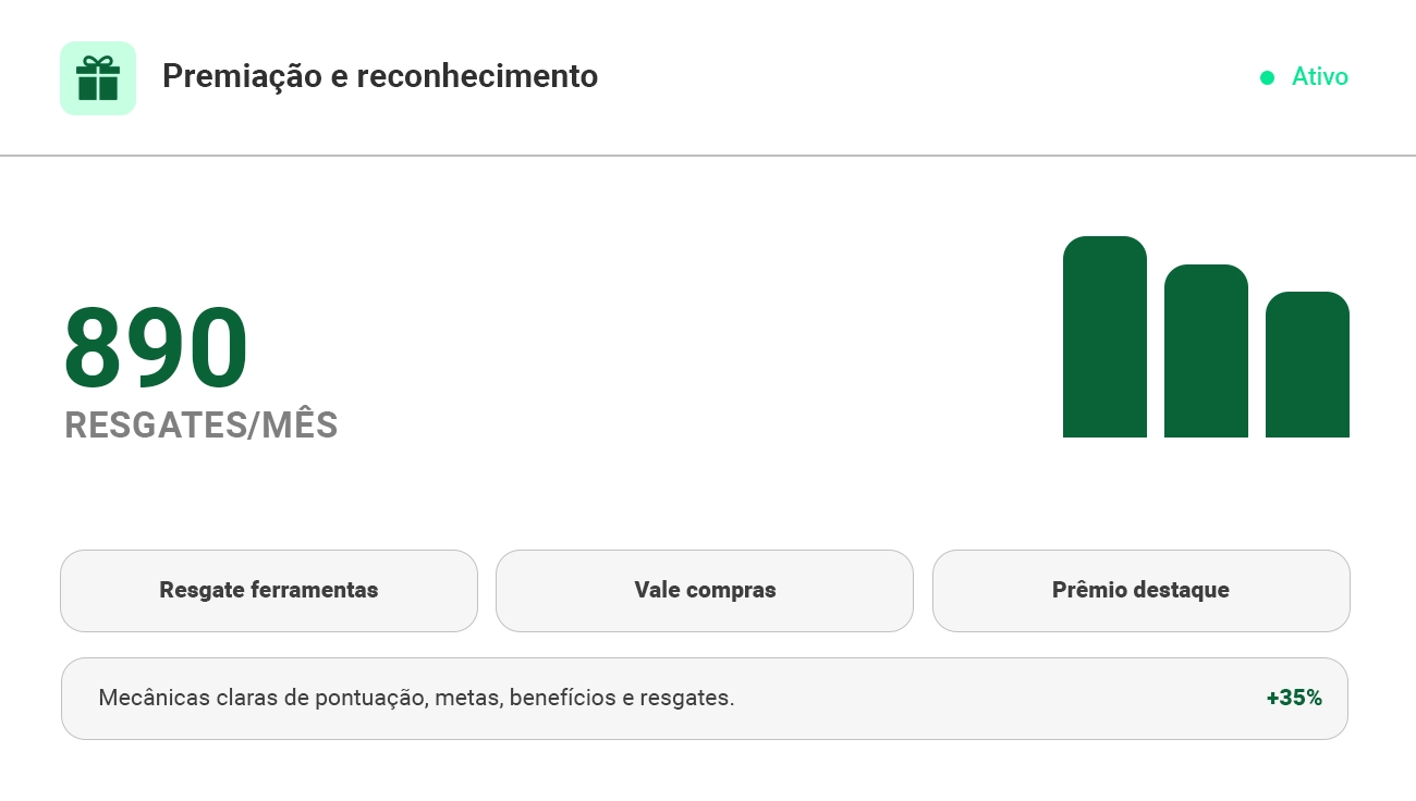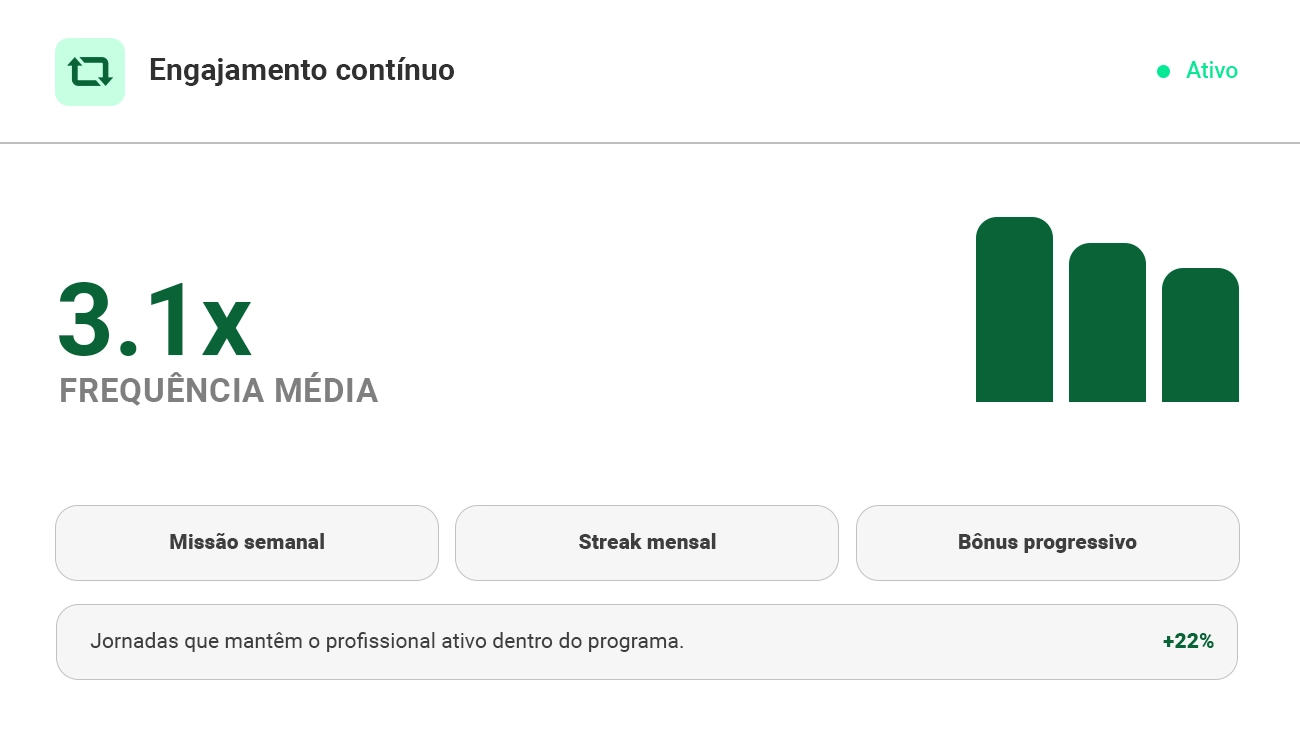 Ranking, progressão, benefícios acumulados e reconhecimento por desempenho mantêm o profissional ativo dentro do programa.