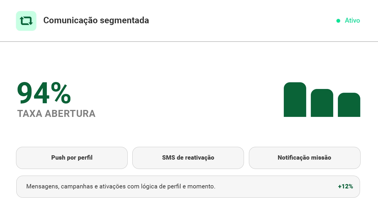 Campanhas segmentadas, recorrência orientada por comportamento e leitura contínua da base para transformar fidelização em resultado.