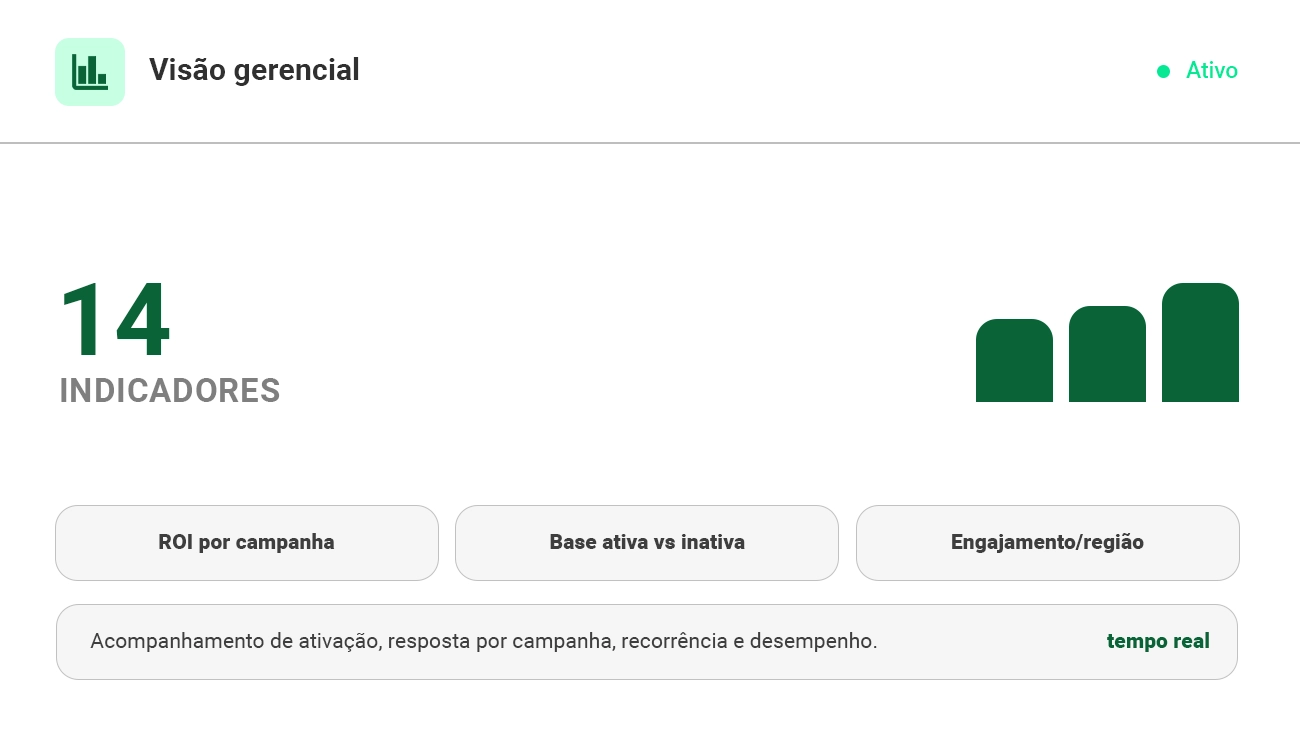 Acompanhe base ativa, participação, resposta por campanha, resgates e recorrência em uma camada gerencial orientada à decisão.