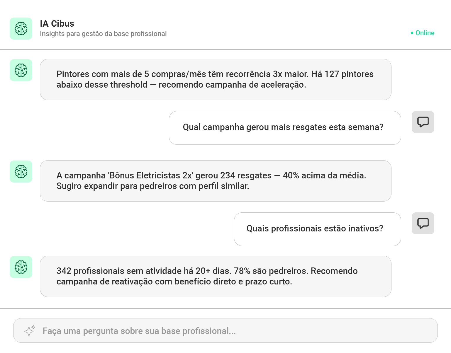 A operação acompanha ativação, frequência, desempenho, campanhas e resposta do público profissional.
